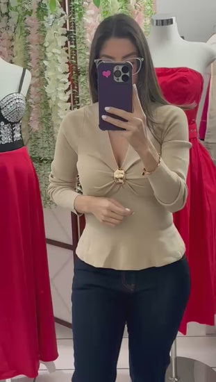 Peplum Long Sleeve Top - Beige
